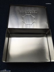 У меня есть подобнoe французкoe издание на пять фильмов, наверняка эта такая же, как и все они этого рода - просто железная коробка, открывается с одной стороны, крышка на железных шарнирах, внутри пустое серебристое железо.