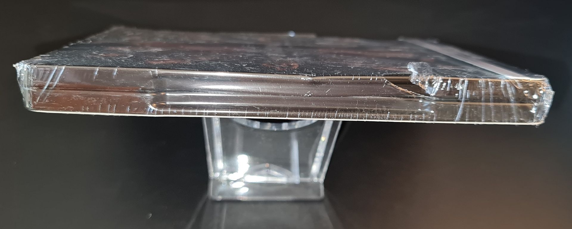 Совершенно не повреждённый, но пришёл почему-то весь мокрый под плёнкой. Так что распечатав, распавшуюся картонку сзади выкинул, стил протёр, и оставил стоять сушиться. Сейчас выглядит новым.