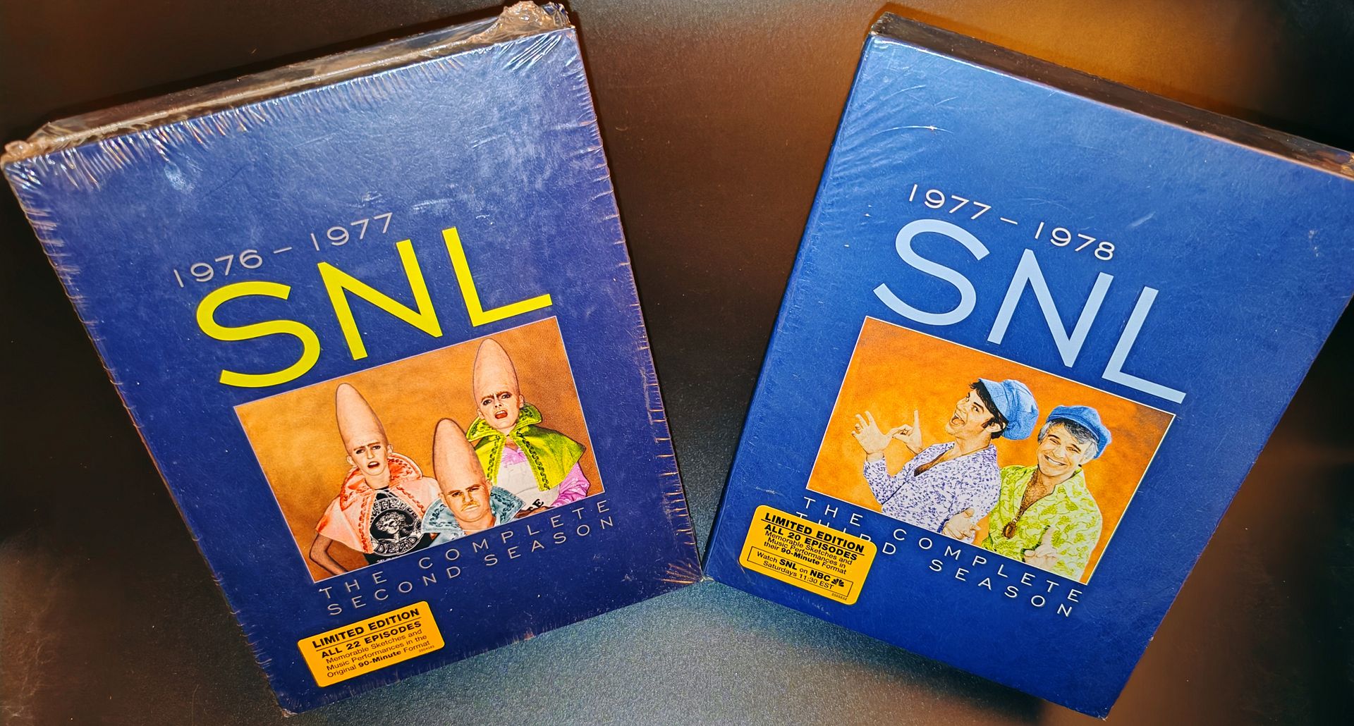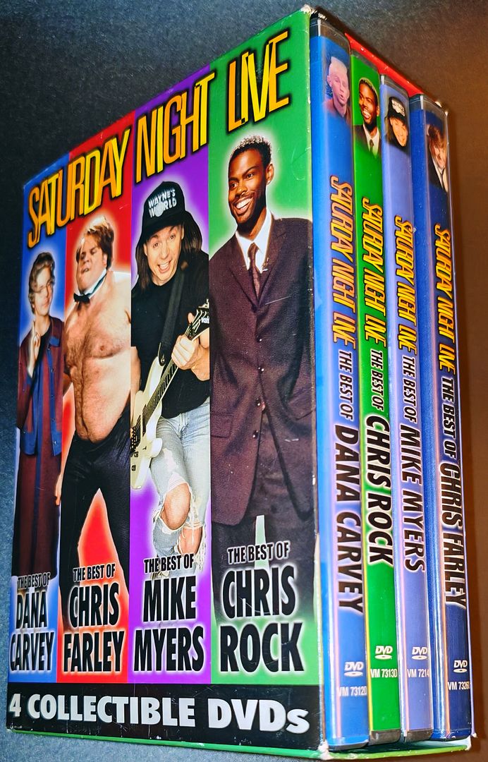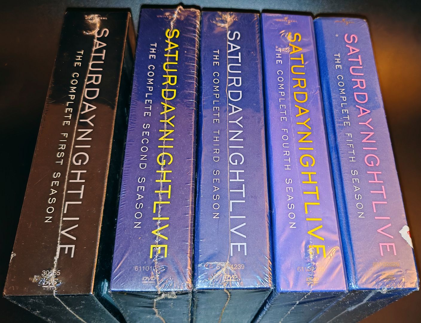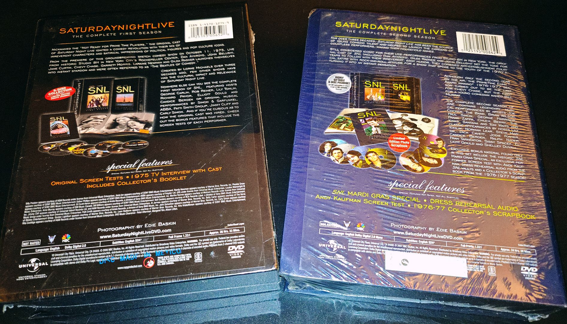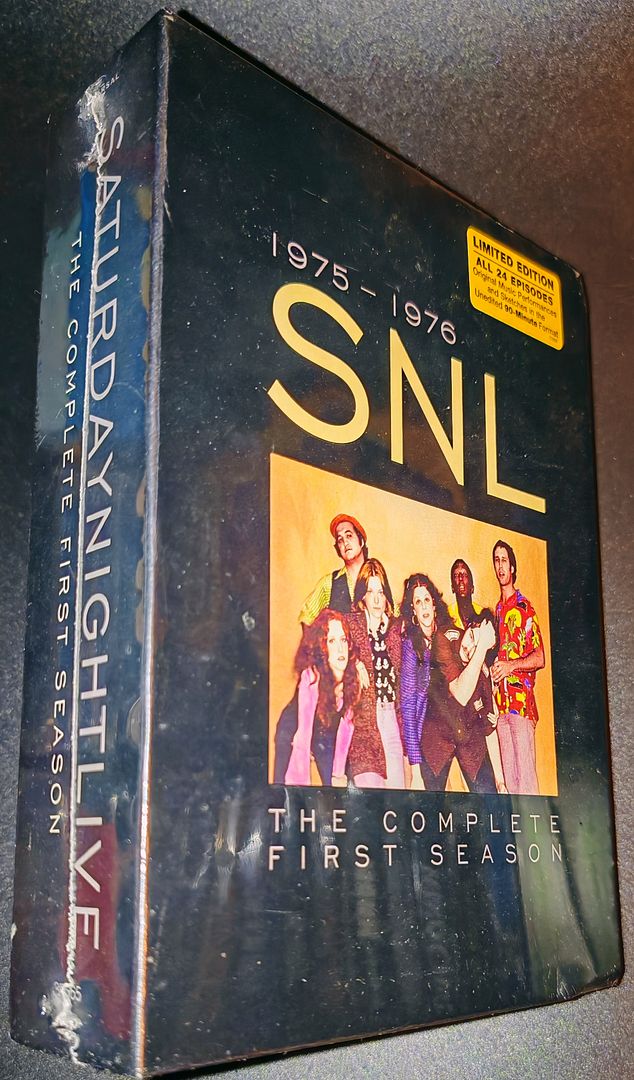Pochtoy #8 Эта коробка была почти вся занята SNL DVD. Несколько месяцев назад, после просмотра фильма Saturday Night, 'вдохновился' собрать все первые сезоны, которые выходили целиком на DVD. Пришлось покупать у 5 разных продавцов, чтобы были именно те первые варианты в коробочках с буклетами или карточками и в диджипаках.   Они пришли немного пыльно-грязные и 'зачуханные'.    Некоторые сезоны были всего $12, некоторые $50, в зависимости от редкости.  К одному из сезонов продавец прилагал и все 11 сборников, но у него выходило дешевле всего за 4-й сезон, так что 'пришлось' взять...  Эти менее $8 с распродажи, обычно добавляю такие когда нехватает до $35 в заказе для бесплатной доставки по США.  Итого 22 издания, и все 21, кроме Escape from LA, впервые в коллекции.