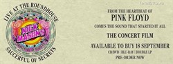 hdmaniacЕщё один подарок для поклонников творчества Pink Floyd готовит ударник Ник Мейсон(Nick Mason) - Nick Mason’s Saucerful of Secrets: Live at the Roundhouse. Премьера этого фильма состоится 10 апреля в ряде английских кинотеатров, за неделю до выпуска концертника на DVD, Blu-ray, CD и LP... Эх, релиза до сих пор нет. Очень жаль.