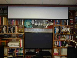 Принцип установки экрана у нас похож -- за экраном у меня пылится плазма 55 дюймов. Стоит как запасной вариант в случае неприятностей с проектором , в моем случае , в конце лета при просмотре "форсажа 6 " вышла из строя лампа , и пока шли терки с сервисным центром , а потом и с продавцом , с грустью смотрел кино по телеку . К хорошему быстро привыкаешь .