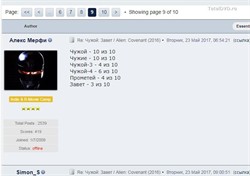 Можно, кстати, вспомнить, что в мае этого года у него было абсолютно противоположное мнение: То ли пересмотрел (фильм с оценкой в три звезды, да) и со второго захода понравилось в 2 раза сильнее, то ли оценки ставятся от мнения окружающих.  Вообще, мнение с тем, что "Завет" лучше "Прометея" может появится таким образом - вот ты идешь на "Прометея" с завышенными ожиданиями, а на выходе получаешь пшик. Вот ты смотришь "Завет", думая, что он полное днище - мнение от чужих отзывов-то уже сформировано, а фильм оказывается чуть лучше.