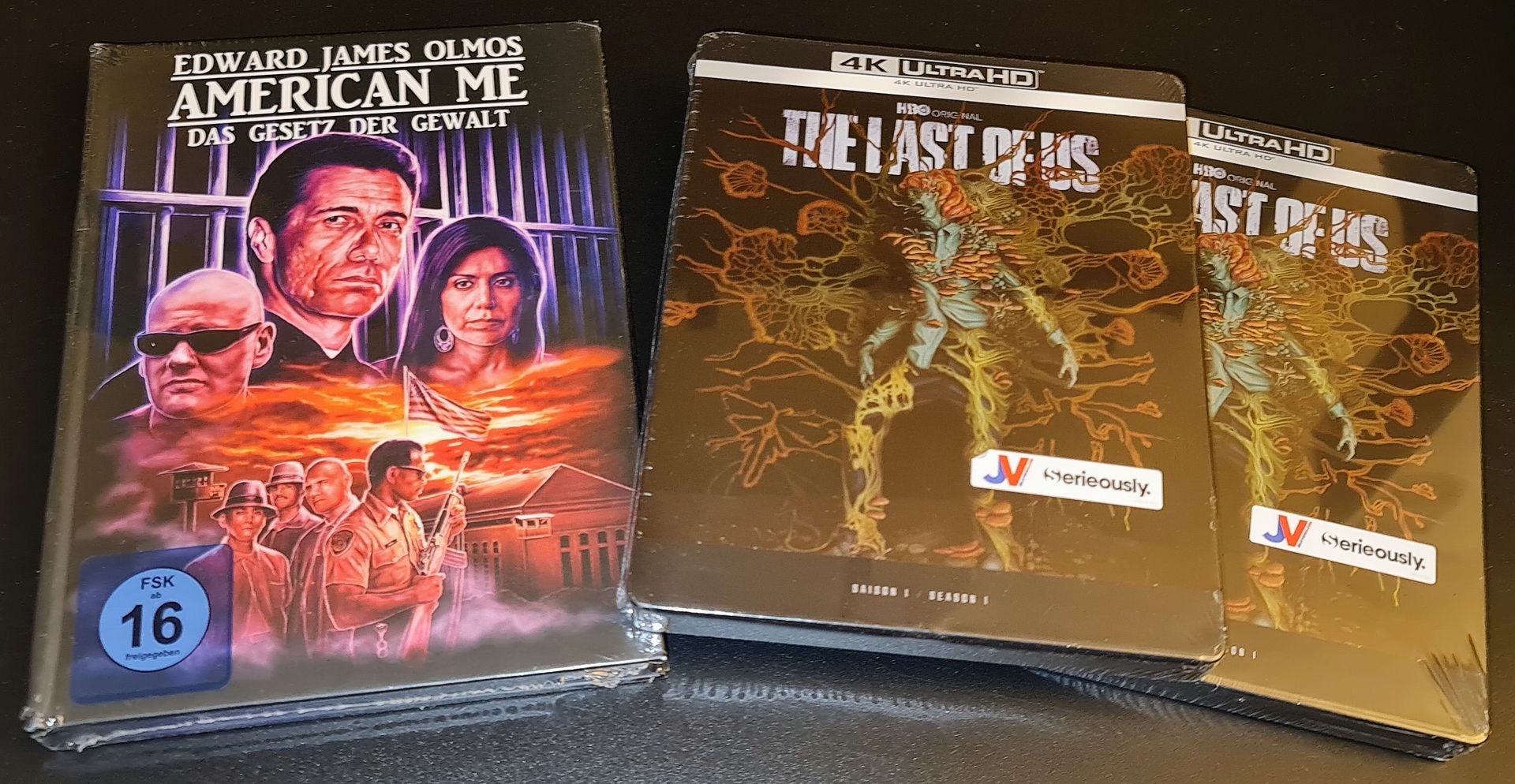 Американская #28  Французские Fnac эксклюзивные боксы с красивым артом. Один из боксов отправили отдельно (из другого заказа) и он до посредника не дошёл, запущен розыск, так просто как Амазон Fnac деньги не возвращает.  Размером с большую 'пластинку' диджибук.  Один из After Hours мой. Ниже всё тоже мне:  Один из Last of Us сезонов продал форумчанину.  С очередной распродажи KinoLorber.  Только впервые в жизни купил The Bounty, как Imprint в Австралии гораздо лучше издание выпустили... Итого 8 изданий, 6 впервые в коллекции.