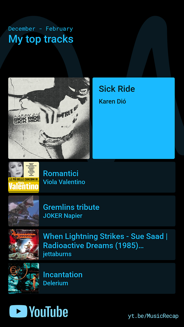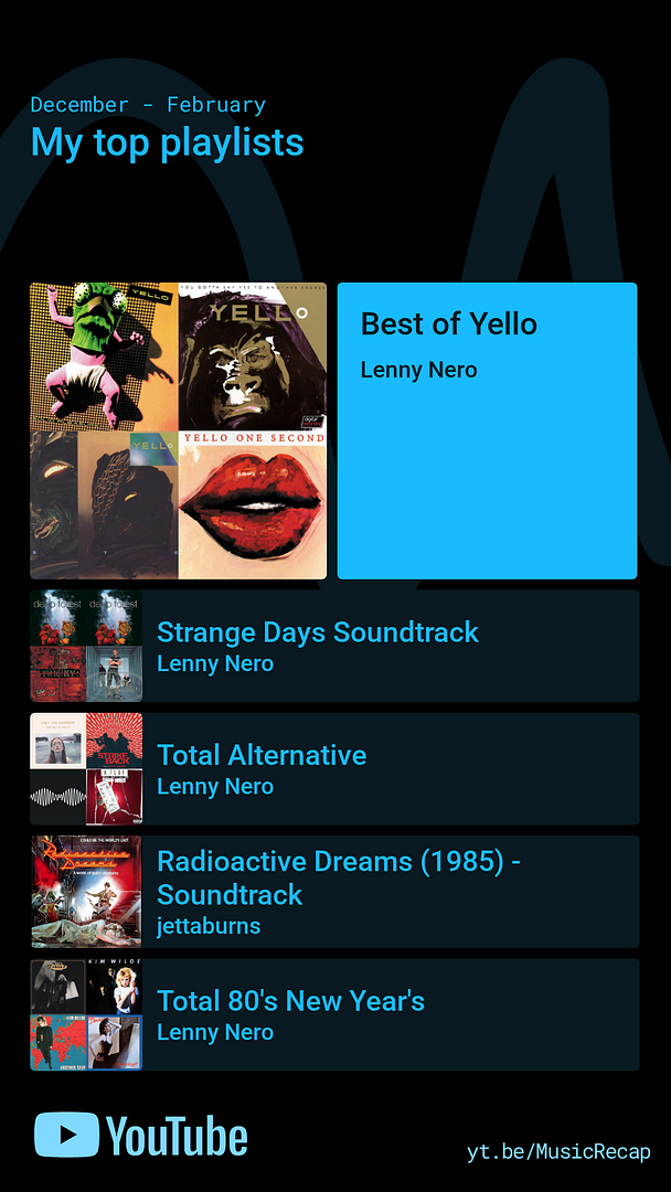 Наконец recap за зиму вышел — я уж начал думать где он.  Переслушивал тогда все первые 8 альбомов Patti Smith, a Babble помогали в создании альбома Traci Lords, поэтому вспомнив о них тоже переслушивал пару их CD.  Как раз в те месяцы саундтреком Radioactive Dreams озаботился, купив единственный в мире CD в издании с немецким DVD. Ну и Romantici раз новый год!  Раз Новый Год, то Strange Days soundtrack и собственный Total 80's плейлист. Новый альбом Kaleida даже купил сразу, а на Rhea's Obsession наткнулся в старых файлах, и с удовольствием переслушивал