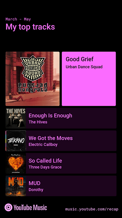 Весенняя статистика YouTube Music за Март-Апрель-Май подоспела:  Абсолютно всё соответствует, только не ожидал Enigma в топ-5...  Тоже всё четко, много эти переслушивал, и все здесь выставил, так что как всегда всё честно, в том смысле я действительно слушаю то, что здесь советую