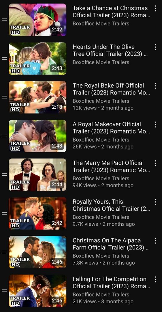 Перечисленные 4 фильма очень хороши, а в остальном не знаю как можно, что-то советовать и выбирать, когда каждый год просто поносище слоновье из этих фильмов. Раньше Hallmark и Lifetime канал их клепали, а сейчас не знаю кто, всякие стримеры наверное. Вот лишь некоторые из плейлиста новых трейлеров: