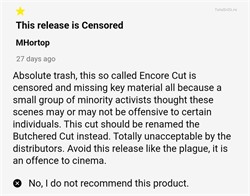 Ой черт, так Encore Cut значит что вырезали для долбоящерных snowflakes какие-то грубости прошлых лет? Edit: почитал в магазине отзывы, ему дыру продрали там, где эти любят, по одной звезде. Ну хорошо что у меня старый Блю-рей есть, засуну его в эту красивую коробочку, я всё равно ради упаковки и карточек-буклета брал, на UHD мне как-то пофиг...