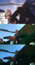 Сжатие MPEG2 строится по принципу дополнения одного цельного кадра (I-frame) кадрами несущими только часть информации (B-frame, P-frame). В зависимости от степени сжатия и применяемого кодировщика эти кадры могут сильно отличаться. Система PAL и 25 кадров тут совсем не причем. Что мешает захватывать ТОЛЬКО ключевые кадры (в них картинка записана целиком)? VirtualDub и WinDVD делают это легко. И вообще: здесь, похоже, собрались любители забалтывать любую здравую идею. Я вам говорю: то, что печает журнал, не имеет отношения к диску, а вы заладили про цветопередачу, как будто это какая-то нерешаемая проблема. Понятно, что телевизор лучше показывает фильмы, чем компьютер, но ведь можно же чуть доработать картинку для печати, но в любом случае мы получим РЕАЛЬНЫЙ кадр фильма. На прилагаемой картинке показано (снизу вверх): в) исходный кадр с лицензионного "Адреналина", б) он же, но поправленный мною для более адекватного восприятия, а) то, что напечатал "Тотал" (постановочный неподвижный кадр, которого в реальном фильме нет - даже пистолет у Рики не в той руке!):