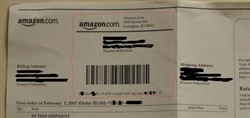 ORIGINAL: Khmer Rouge [Добавлю от себя. Дело в том, что форма счета у amazon.com предусматривает наличие стикера. Информация, которая должна появиться на стикере, располагается при печати вверху, левее амазоновского логотипа, расположенного в левом верхнем углу счета. В некоторых же американских центрах счет печатается на спецбумаге, где есть окошко для стикера, который они потом снимают и лепят на коробку. Т.е. если в счете есть дырка, закрытая полупрозрачной бумагой, то этот стикер надо искать на коробке. Только не левее, а правее. И выглядит это всё примерно так, как в приложенной картинке. Красным цветом обвел примерную область стикера. Там как раз адрес склада и сидит. С каких-то складов выходит накладная на обычной бумаге, с каких-то - на бумаге со стикером. Иногда стикер остается на месте (почти на всех недавних курьерских заказах у меня было именно так), иногда его переклеивают на коробку. ORIGINAL: Khmer Rouge А что значит из "4 шмоток"? Тебе удалось как-то получать от амазона одежду?[sm=ai.gif] Это значит 4 предмета (4 items). Понятно, что если в посылке 8, то этот огрызок будет побольше, чтоб туда 8 записей реально влезло. Один раз посмотрел про одежду - фирменная симпсоновская маечка, так ее продавали не совсем селлеры, а какая-то спец. компания. В списке стран России не было, была Украина. В корзину всё легло, стоимость доставки где-то 20 баксов+4 за предмет. В тот раз заказ делать не стал.
