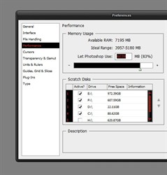 ORIGINAL: Aandreev А что касается фотошопа - ему для нормальной работы не так уж и много надо. Вопрос что считать нормальной работой, конечно? Народ в массе вообще не понимает что такое Photoshop. А есть и другие примеры. У меня есть знакомый фотограф, так он делает сканы с плоской пленки (9х12 см) на сканере стоимостью 18000 евро. Так один файл получается под 400 мегабайт. Пара слоев и аля-улю. Кстати у него Apple Cinema Display - 30 дюймов. Доволен (с чем и я согласен), хоть и экран глянцевый  У меня стоят вот такие цифры в Photoshop-е и надо сказать бывают случаи притормаживает.