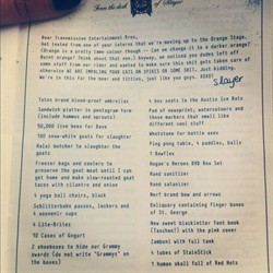 Концертный райдер группы Slayer: [image]local://19990/9CD6B637F55F431298D526DE002916CA.jpg[/image] [:@] 50000 живых пчёл для Дэйва.  Оселок для боевых топоров