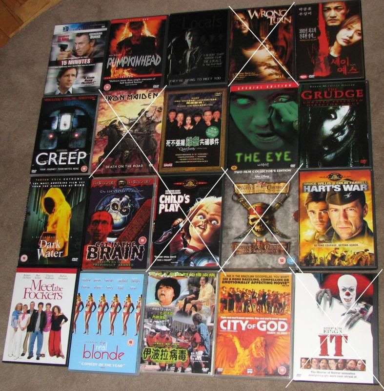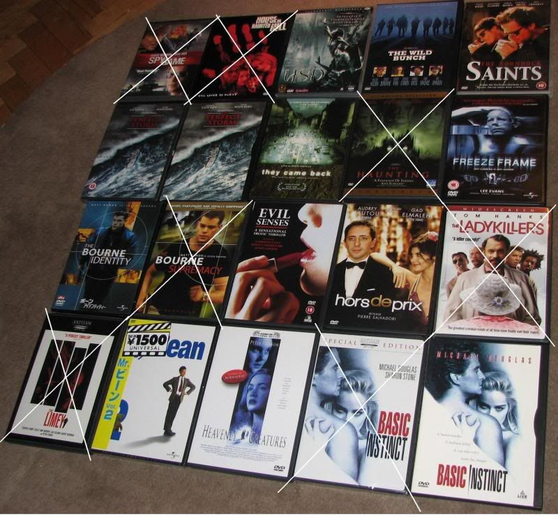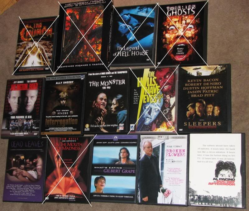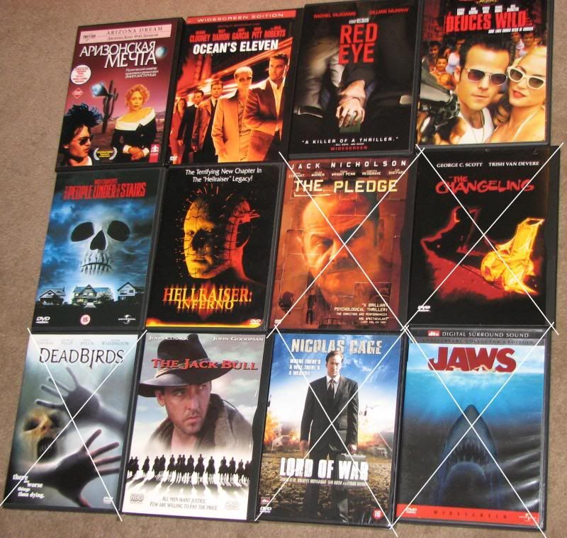 Кто берет четыре диска по 100 р., получает любой пятый диск за 100 р. бесплатно! ВСЕ ПО 100р. Hell (R3) - только тайская дорожка, без субов The Wild Bunch (R1) The Boondock Saints (R2) The Perfect Storm (R2) запечатан The Perfect Storm (R1) They Came Back (R1) Freeze Frame (R2) Bourne Identity (R2 jap) Evil Senses (R2) Hors de prix (R2) - только французская дорожка, без субов Mr. Bean vol 2 (R2 jap) запечатан Heavenly Creatures (R2) Basic Instinct (R1) Arlington Road (R1) Interrogation of Michael Crowe (R1) The Monster (R3) Sleepers (R1) Dead Leaves (R1) What's Eating Gilbert Grape (R1) Broken Flowers (R1) Dog Day Afternoon (R1) Аризонская мечта (R5) Ocean's Eleven (R1) Red Eye (R1) Deuces Wild (R1) People Under the Stairs (R2) Hellraiser: Inferno (R1) The Jack Bull (R1) 15 Minutes (R1)