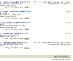 ORIGINAL: gonchi Интересно, а что будет если сделать сейчас заказ на амазоне (с курьерской доставкой) и попробовать объединить его со старым заказом (еще не исполненным) expedited? Уж очень хочется Six Feet Uder приобрести по такой хорошей цене :) Есть мнение, что в момент объединения предложут согласиться на новую доставку, тем более при объединении доставка пересчитывается всегда.