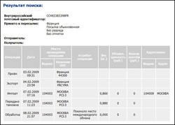 Те, кто трекает посылки на russianpost, подскажите пж-та, какая информация там обычно видна и как долго она сохраняется. Вот что выходит у меня по поиску: Принято к пересылке: Без разряда Без отметки Отправитель: пусто Получатель: пусто. А что обычно выдает трекинг? Нужно для работы :) Своих заказов сейчас нет, поэтому на себе проверить не могу :)))