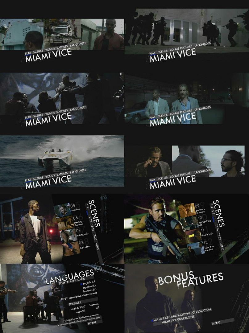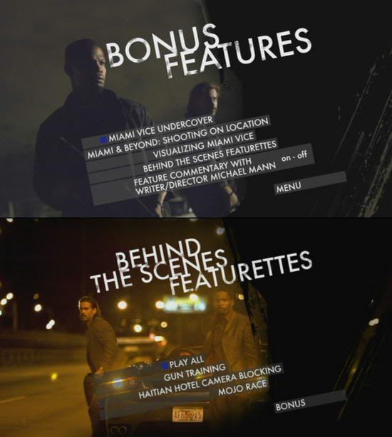 Miami Vice Theatrical & Unrated R1 Главное меню анимировано, остальные разделы статичны. Театральная версия, та же что и на HD-DVD комбо диске, не содержит комментария а также четырех других феачуреток которые имеются на Директорской версии, как показано ниже. В остальном меню одинаковы.