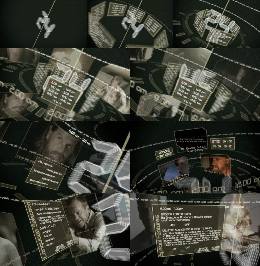 24 Season 6 R1 Disc 1 Для шестого сезона меню сделали более интересными, с анимированными вращающимися панелями выбора эпизодов и бонусов всех семи дисков в главном меню каждого. К большинству эпизодов есть коммент, вырезанные сцены, или и то и другое. Все документалки, интернетовские феачуретки, вебизоды, и другое, находится на седьмом диске.