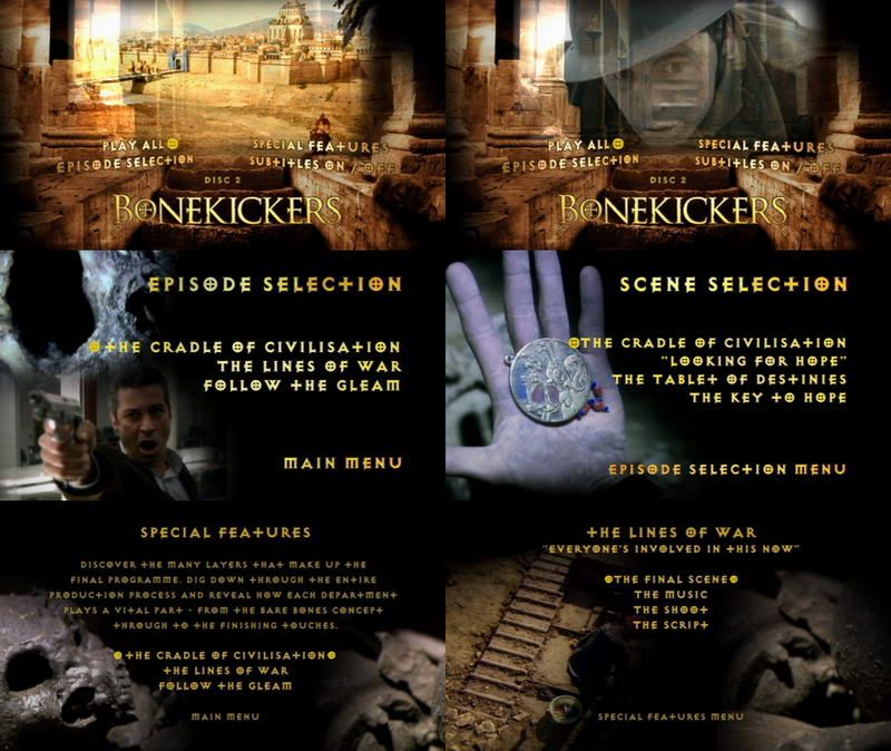 Bonekickers R2 UK Главные меню дисков анимированы, остальные статичны. К каждому эпизоду прилагается несколько коротких фичуреток о различных этапах создания этой конкретной серии. Disc 1 Disc 2