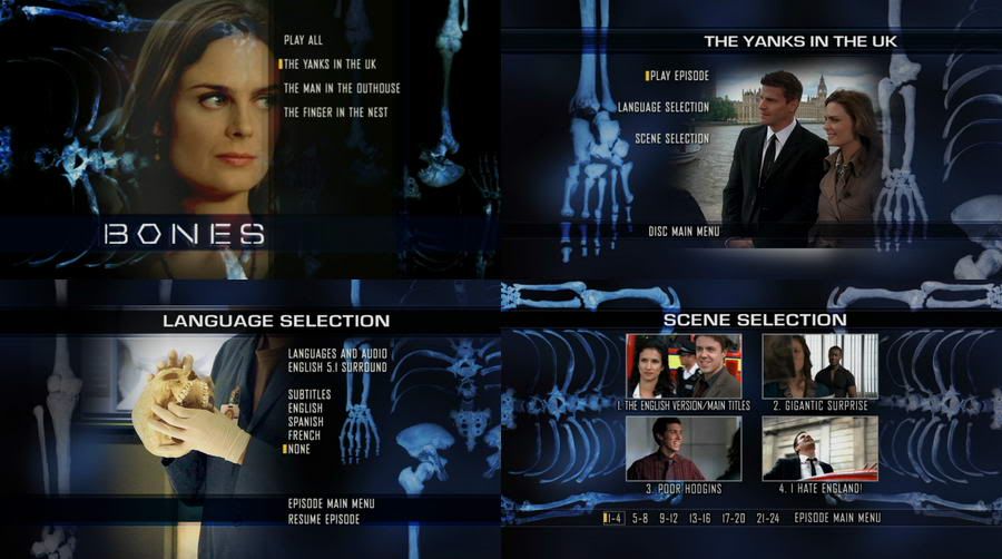 Bones Season Three R1 Disc 1 Главное меню хорошо анимировано, остальные разделы статичны. Бонусы собраны на первом диске, а пятый отдан под три (первый двойной) эпизода четвертого сезона. Disc 5 Меню оформлено так же, лишь в синеватой цветовой гамме.