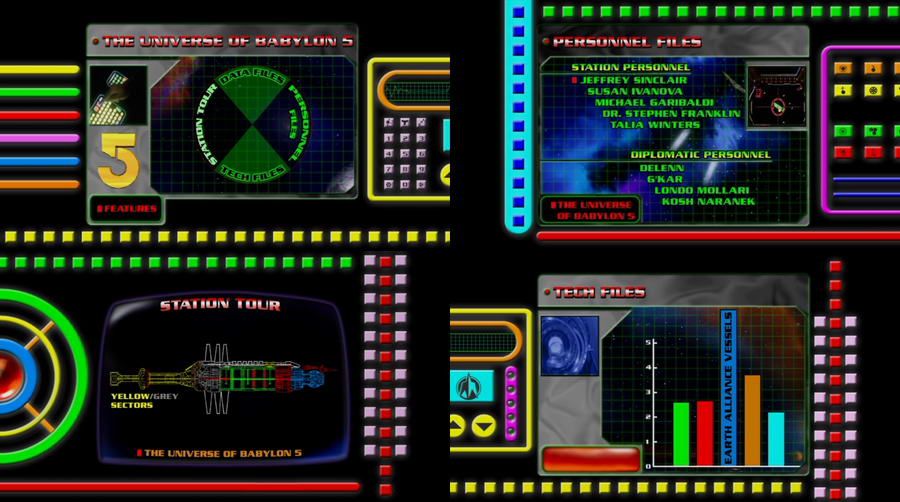 Babylon 5 The Complete First Season R1 Discs 1 & 6 Главное меню анимировано, остальные разделы статичны. Большинство бонусов собрано на последнем диске. Текстово-графическая база данных The Universe of Babylon 5 довольно обширна и ее выборочные скрины представлены отдельно по ссылке ниже.